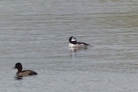 A photo showing the relative small size of the Bufflehead when compared to the adjacent drake Tufted duck