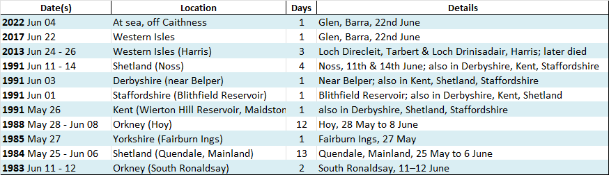 The first British record dates back to 1846, when one was shot at Great Horkesley in Essex – the specimen now housed in Chelmsford Museum. The first ‘modern’ record (post-1950) came from Orkney in 1983. The most recent ‘twitchable’ bird occurred in 2013 across the Western Isles, where many birders enjoyed views before the bird tragically collided with a wind turbine.